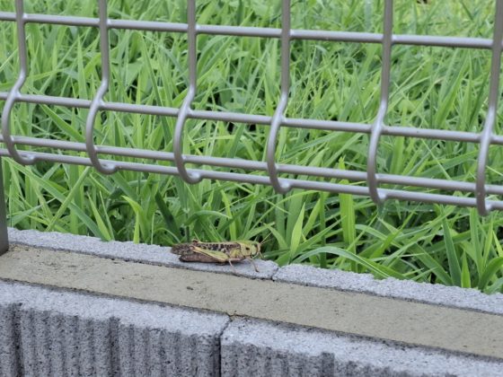 調査中、ふと気がつくと草むらからバッタがピョンと登場。